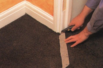 Отрежьте лишний край ковра, ведя острый рабочий нож вдоль вдающегося угла между рейкой-захватом и плинтусом, как показано.